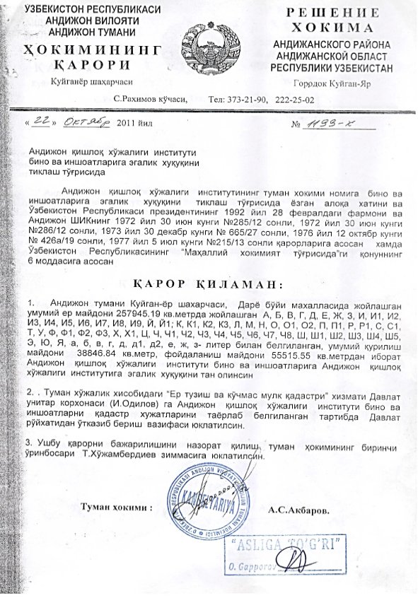 Y,Y1; K, K1, K2, K3, L, M, N, O, O1, O2, P, P1, S1, S1, T, U, F, F1, X, X1, CH, CH1, CH2, CH3, CH4, CH5, CH6, CH7, CH8, SH, SH, SH1, SH2, SH3, SH4, SH5, E, YU, YA, a, b, v, g, d, d1, d2, e, j, z- with letters Andijan Institute of Agriculture and Agrotechnologies received the right of ownership. This right of ownership was confirmed by the decision of the governor of Andijan district, Andijan region, dated October 22, 2011, No. 1199-x.